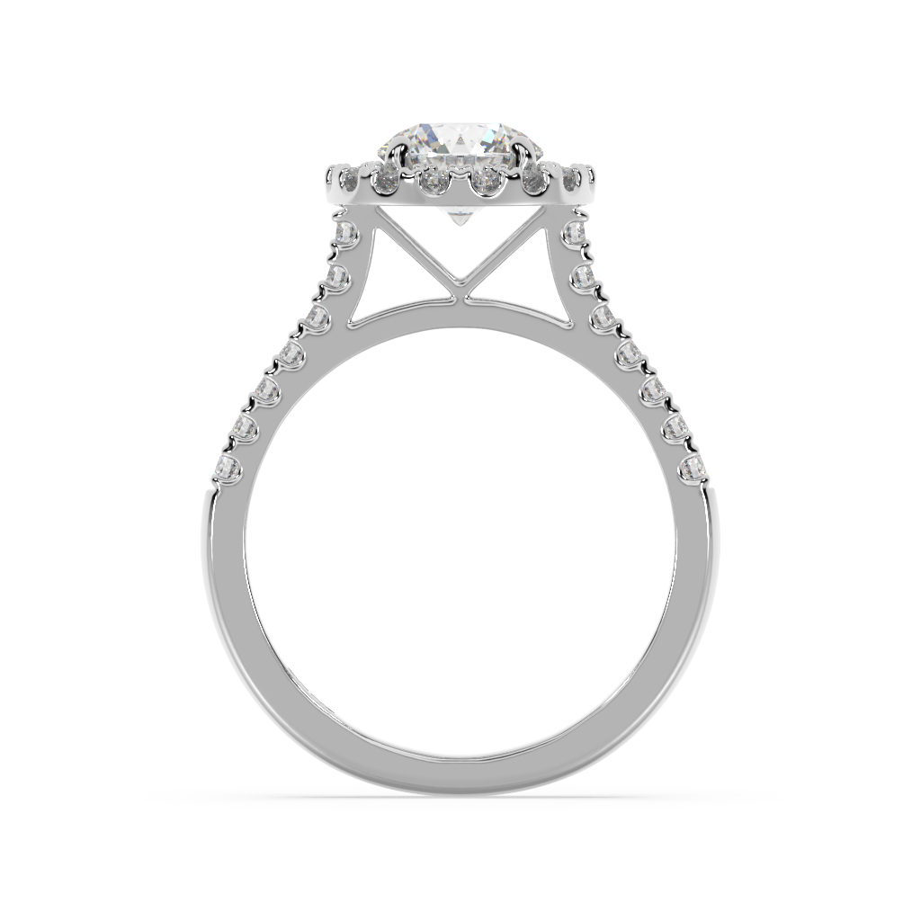 Round brilliant cut diamond shared claw halo engagement ring