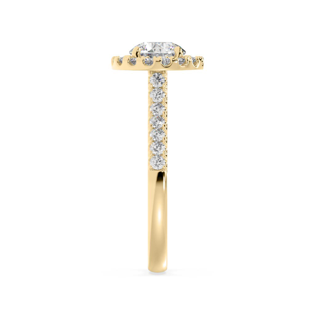 \n Round brilliant cut shape diamond (1.00ct shown)\n 16 x 0.015ct round brilliant cut diamonds shared claw set into halo\n Total halo diamond weight = 0.24ct\n (based on 1.0ct centre diamond as shown, not including centre diamond)\n 14 x 0.015ct round brilliant cut diamonds, shared claw set into shoulders\n Total shoulders diamond weight = 0.21ct\n Vee style halo supports\n Half round band profile\n 2.20mm wide band\n