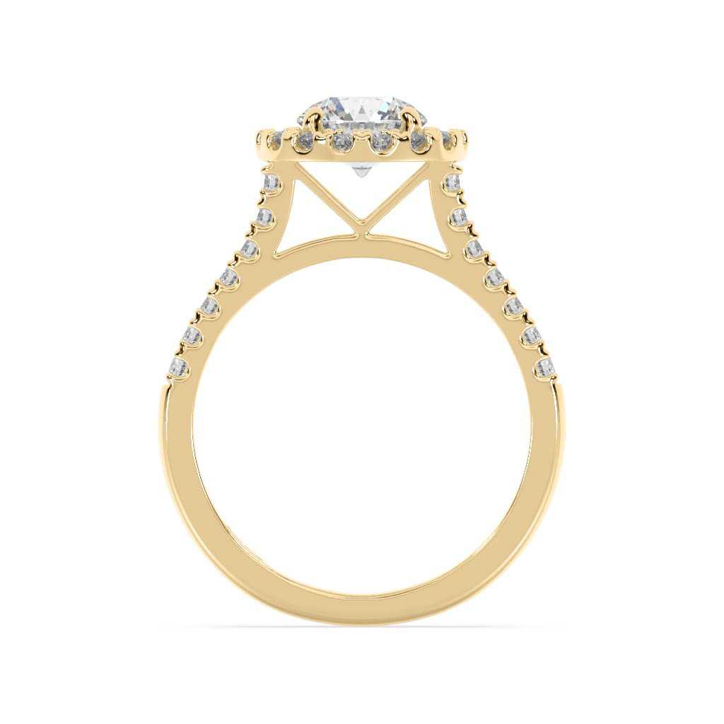 \n Round brilliant cut shape diamond (1.00ct shown)\n 16 x 0.015ct round brilliant cut diamonds shared claw set into halo\n Total halo diamond weight = 0.24ct\n (based on 1.0ct centre diamond as shown, not including centre diamond)\n 14 x 0.015ct round brilliant cut diamonds, shared claw set into shoulders\n Total shoulders diamond weight = 0.21ct\n Vee style halo supports\n Half round band profile\n 2.20mm wide band\n