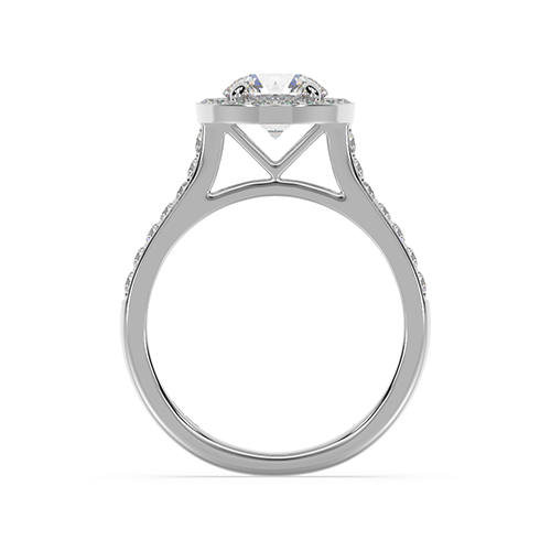 Round brilliant cut vee style halo engagement ring with bead set shoulders