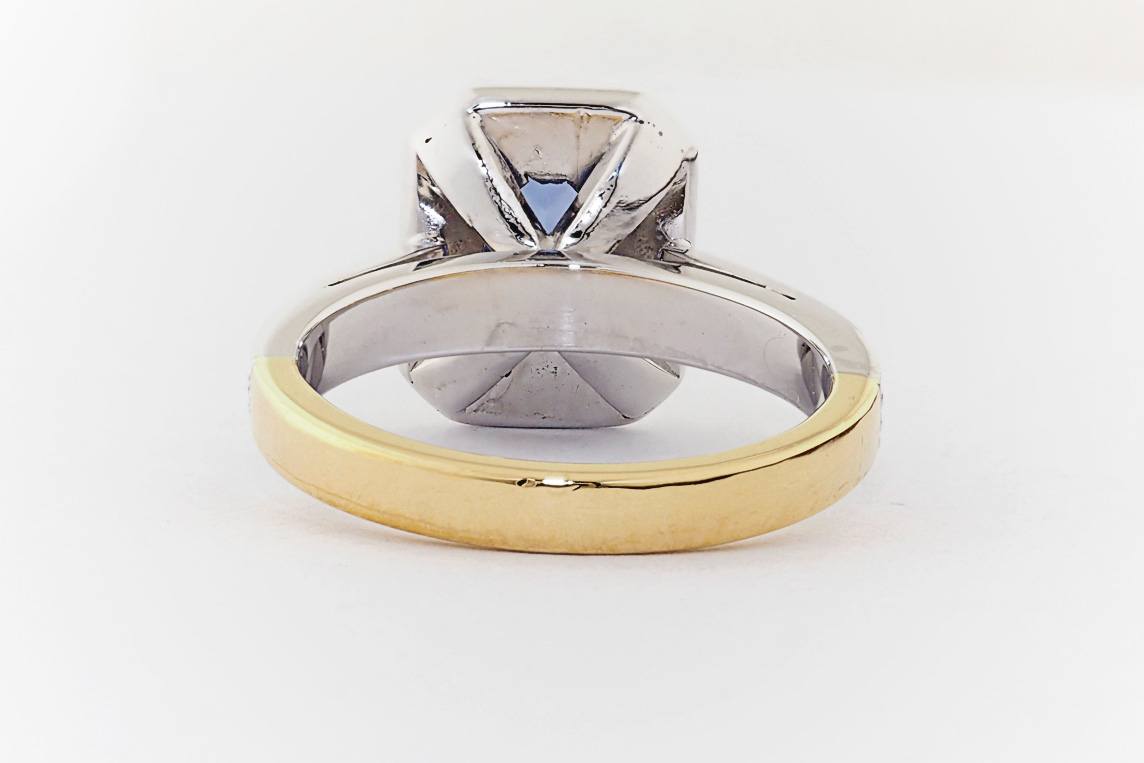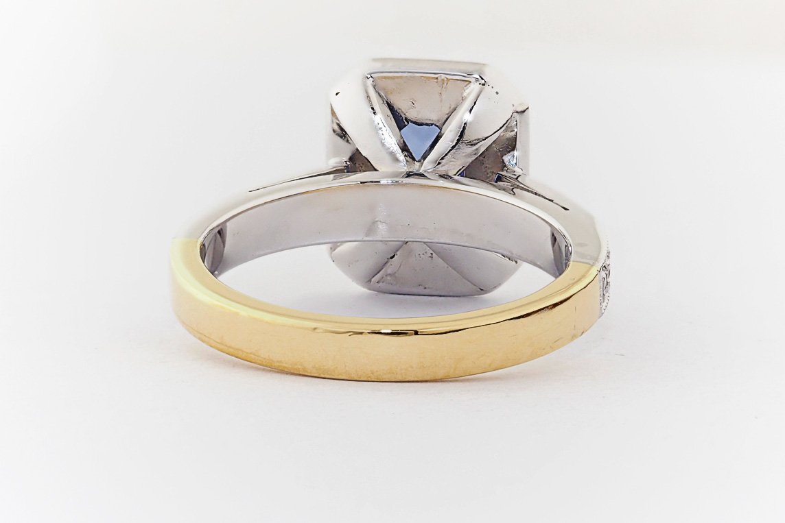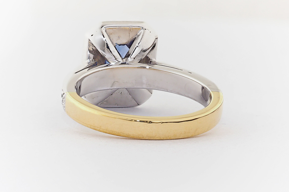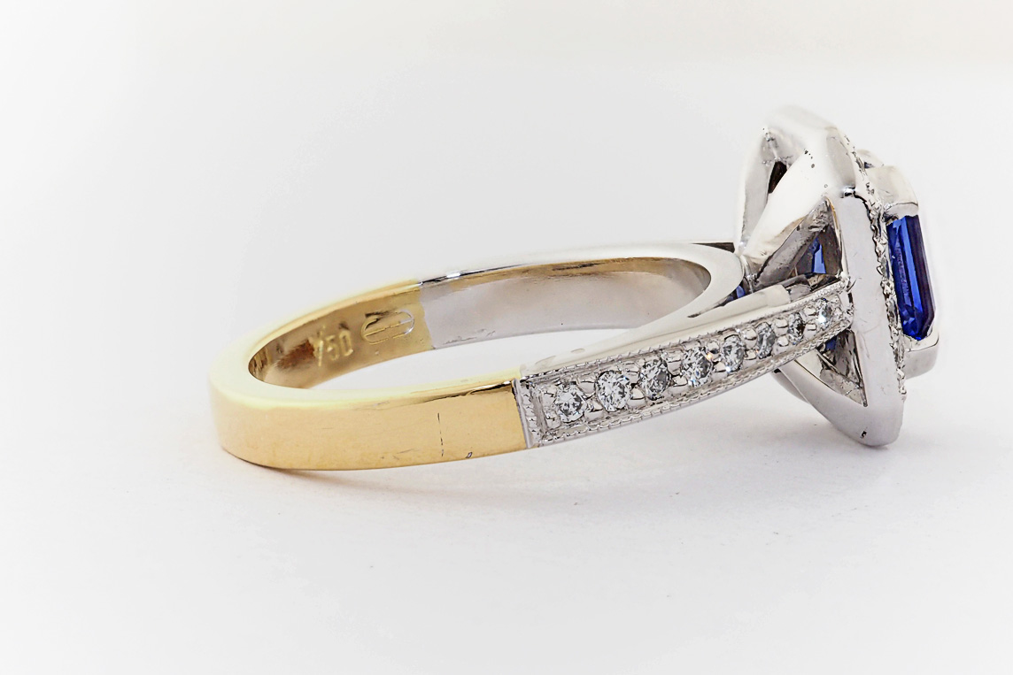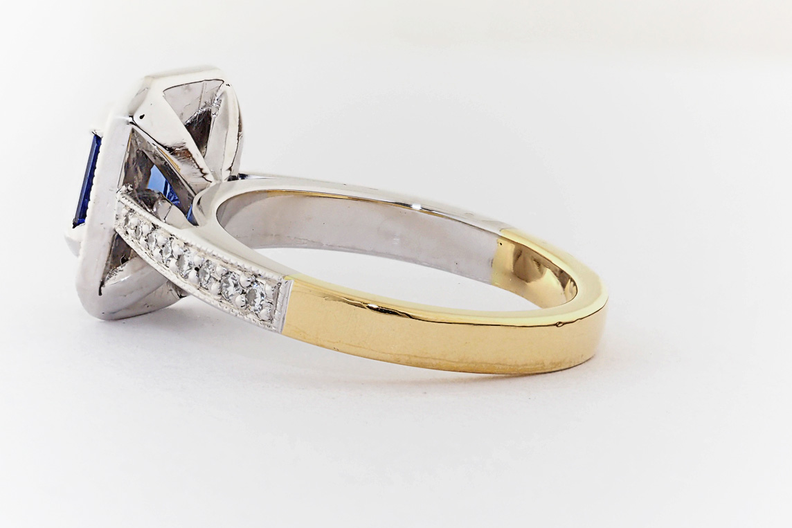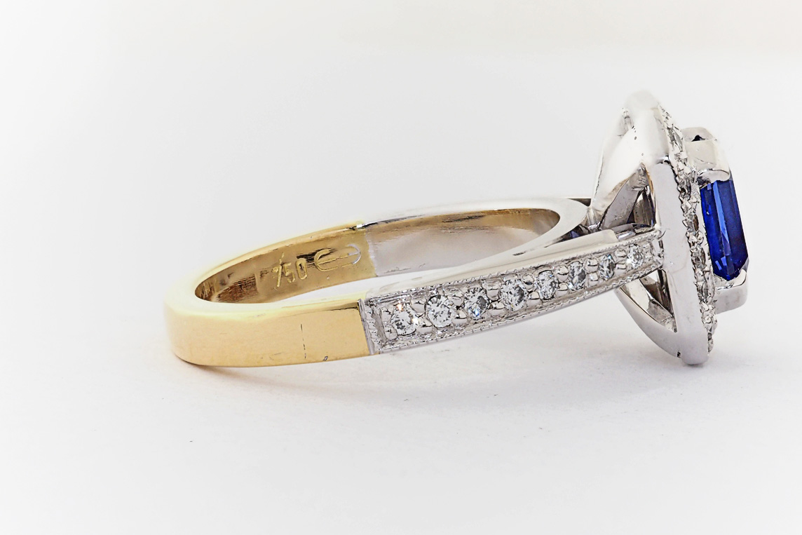 Two tone gold, sapphire and diamond halo engagement ring