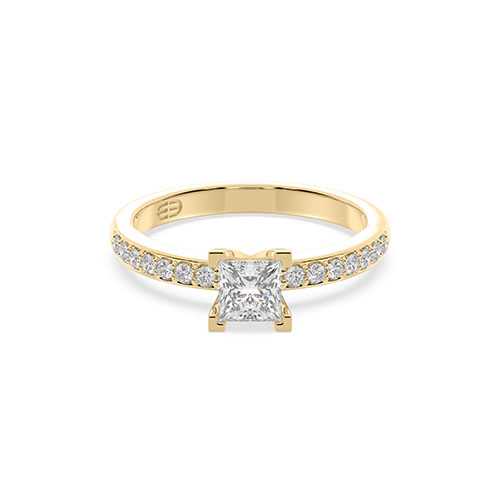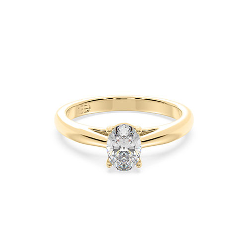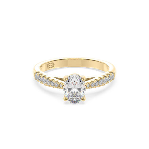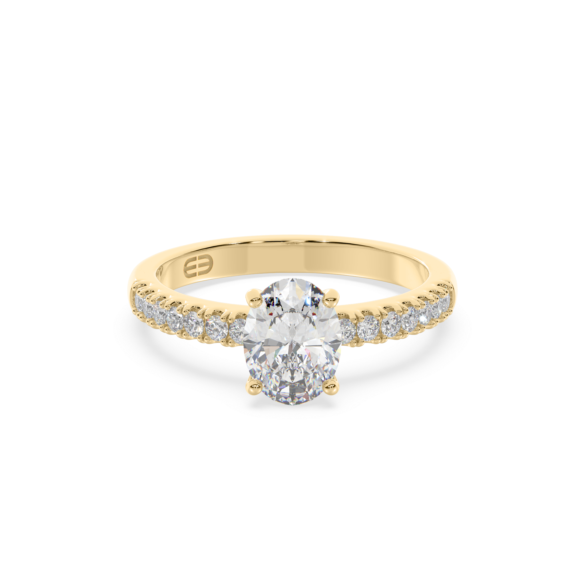 Yellow gold engagement ring with oval diamond and split shared claw shoulders