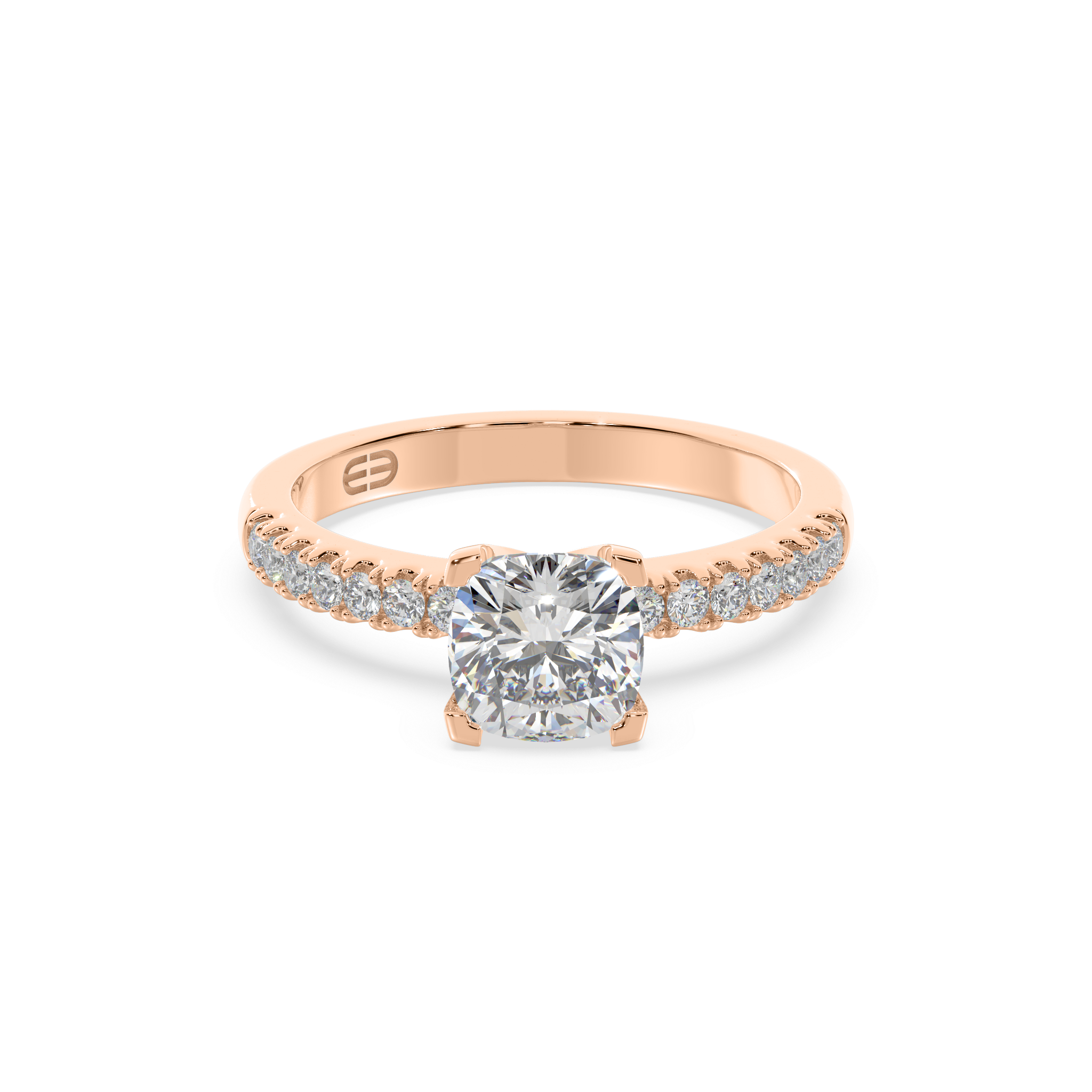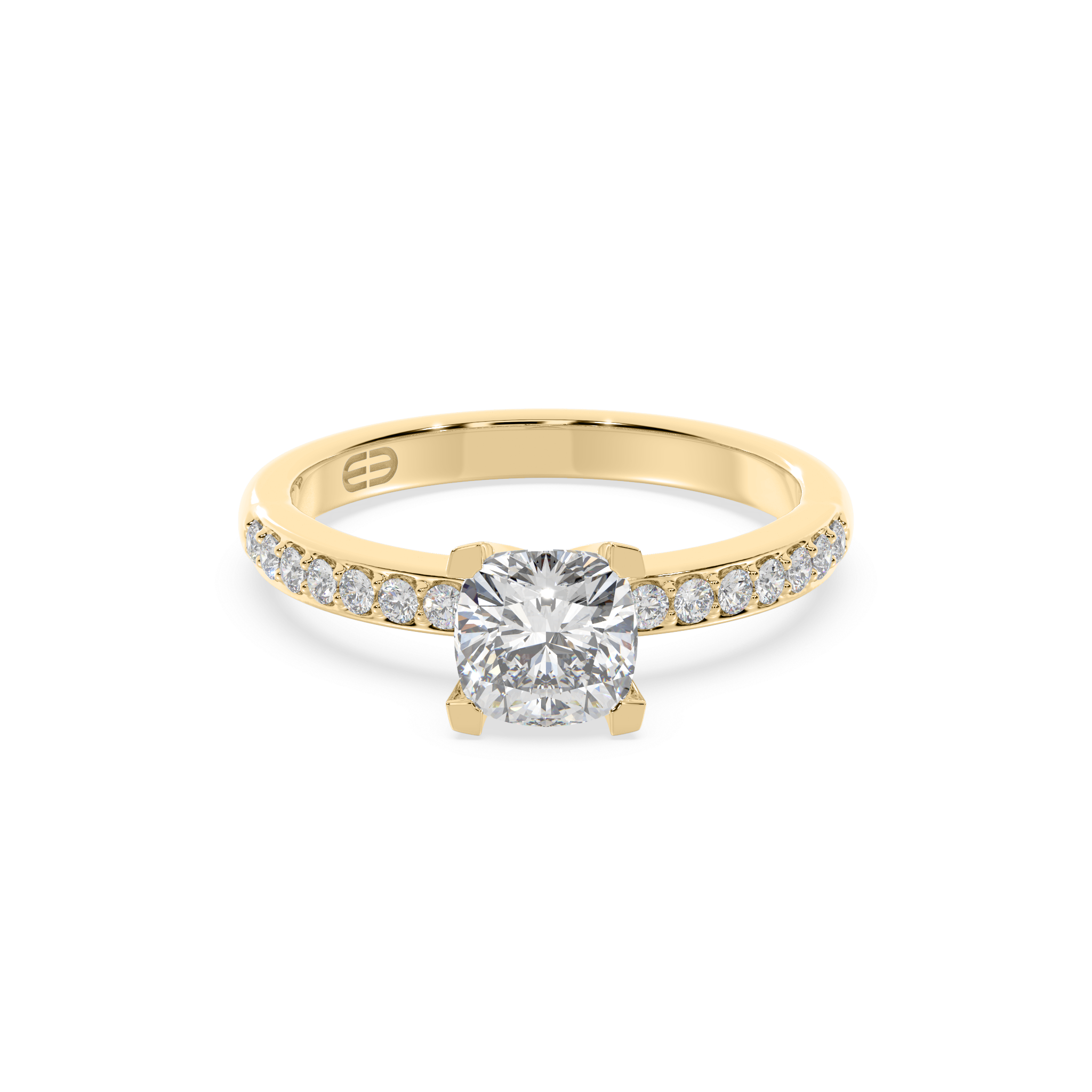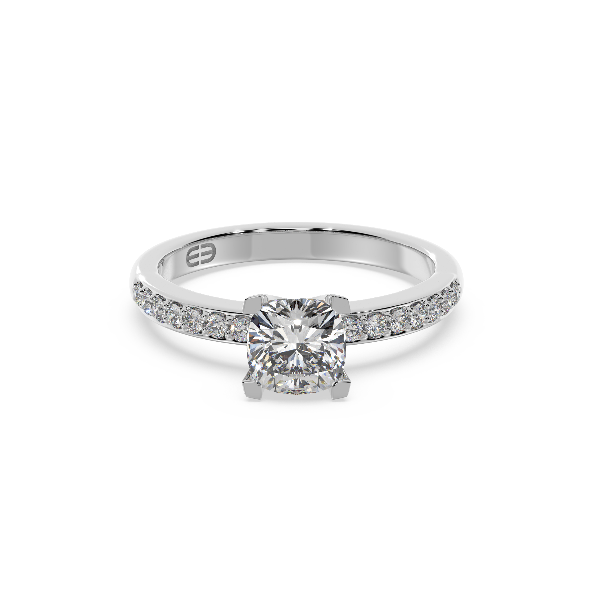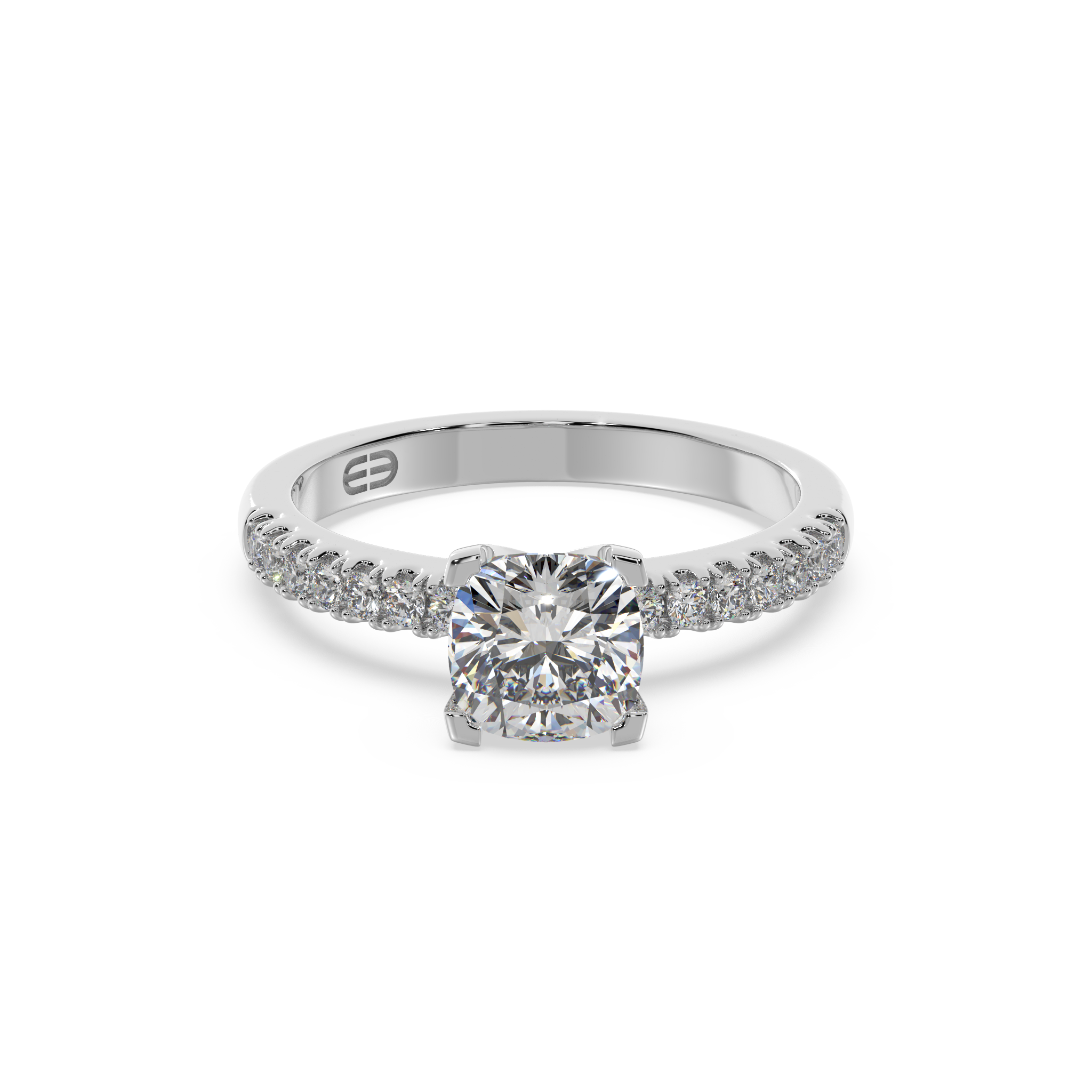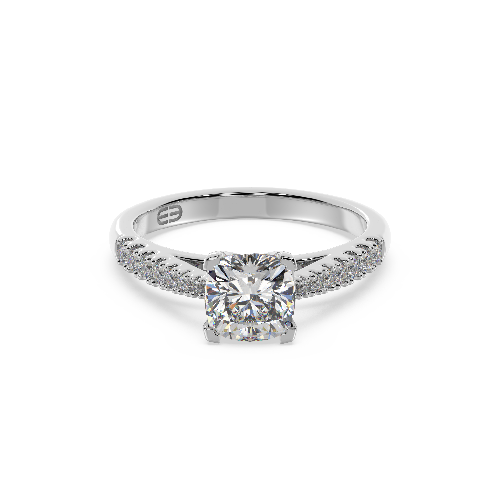 Cushion diamond engagement ring with tapered split shared claw shoulders